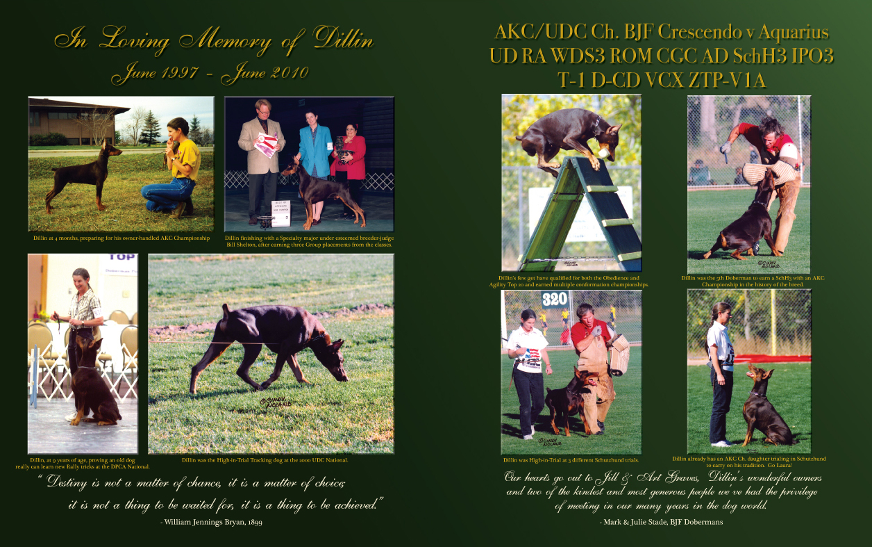 Dillin (who was owned by the phenomenal Jill and Art Graves) is the paternal grandsire to Dare, the dam of our next planned Doberman litter in 2015. Living to just short of his 13th birthday, Dillin will continue to play a prominent role in our breeding program through his successful descendants.